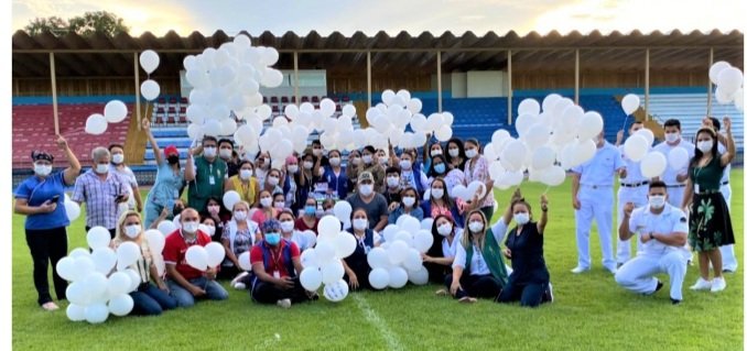 Para registrar o resultado e agradecer os servidores e colaboradores que atuam na organização, recepção, triagem e vacinação do público, a coordenação da unidade organizou uma comemoração simbólica reunindo as equipes que atuam no ponto, com bolo e soltura de 500 balões brancos com frases de esperança pelo fim da pandemia.
