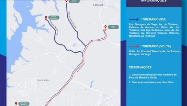 A partir da próxima segunda-feira, 9/5, a Prefeitura de Manaus, por meio do Instituto Municipal de Mobilidade Urbana (IMMU), coloca em operação uma nova linha de ônibus, a 642 – T3/Avenida do Turismo/Ponta Negra, que irá reforçar o itinerário da linha 641 – T4 – T3 – aeroporto – Ponta Negra.