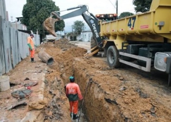 Equipes da Prefeitura de Manaus, por meio da Secretaria Municipal de Infraestrutura (Seminf), atuam, de forma emergencial, na recuperação de uma rede de drenagem profunda com 60 metros de extensão, rompida na rua Athenas, conjunto Campos Elíseos, na zona Centro-Oeste da capital.