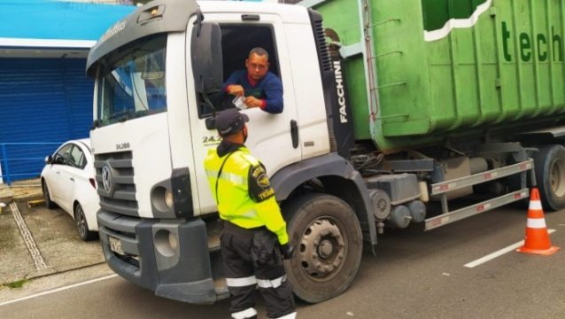 Agentes de trânsito, em conjunto com o Batalhão de Policiamento de Trânsito da Polícia Militar (BPTran), fizeram abordagem de caminhões para verificar as condições dos veículos, assim como a documentação obrigatória dos motoristas.