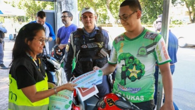 Os motociclistas que trafegavam, nesta quarta-feira, 11/5, na avenida Brasil, zona Oeste de Manaus, foram surpreendidos com uma blitz educativa promovida pela Prefeitura de Manaus, por meio do Instituto Municipal de Mobilidade Urbana (IMMU) e parceiros. Durante as abordagens, os motociclistas receberam material educativo, além de orientações sobre segurança no trânsito e até um vale para troca de óleo gratuita. A atividade faz parte do “Maio Amarelo”, campanha internacional voltada para reduzir vítimas de acidentes de trânsito.