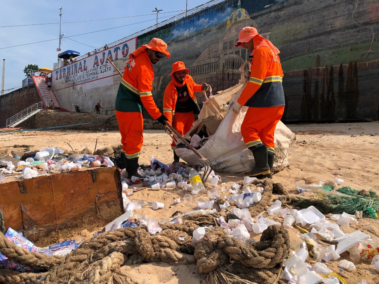 A Prefeitura de Manaus, por meio da Secretaria Municipal de Limpeza Urbana (Semulsp), recolheu grande quantidade de sujeira depositada na orla da Manaus Moderna, no Centro, neste sábado, 8/10. Com a seca do rio Negro, o lixo acumulado ficou mais visível.
