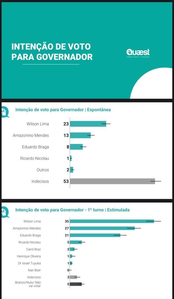 A 18 dias para a realização do primeiro turno das Eleições 2022, o atual governador do Amazonas e candidato a reeleição, Wilson Lima (UB), lidera a disputa pelo cargo com 35% das intenções de voto, seguido por Amazonino Mendes (Cidadania), com 27%, em cenário estimulado, aponta uma nova pesquisa realizada pela Quaest Consultoria, contratada com exclusividade pela Rede Onda Digital, divulgada nesta quarta-feira (14).